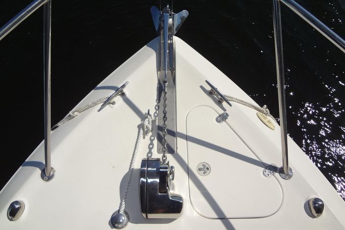 Side decks are narrow, so foredeck access is mainly via the walk-through windshield rather than walking along the sides.