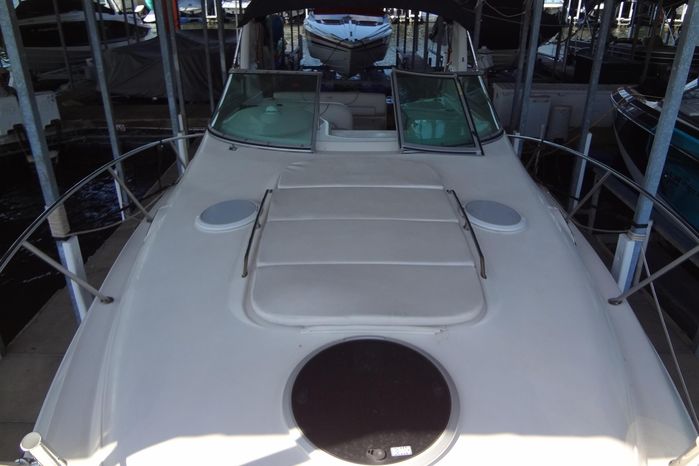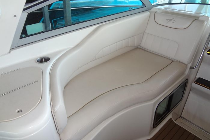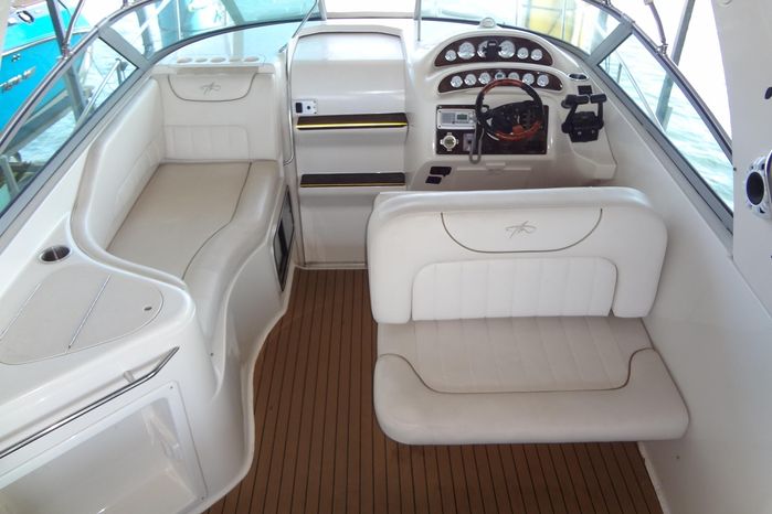 Factory (or often fitted) power: twin Volvo Penta 5.0Gi sterndrives in the 260 hp range. With those, cruising speed is around 25 knots, with a top speed just under 40 knots.