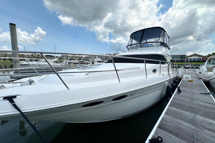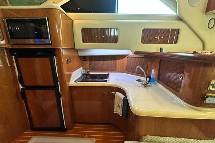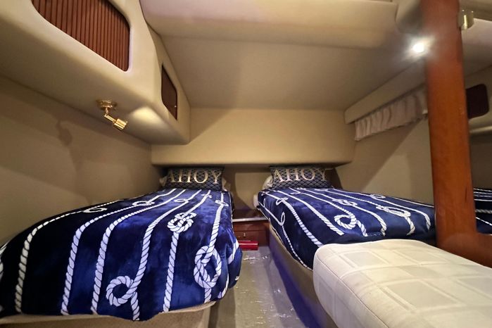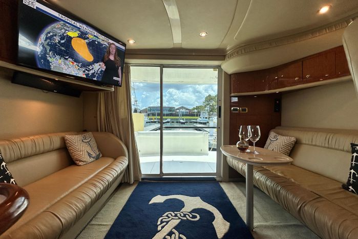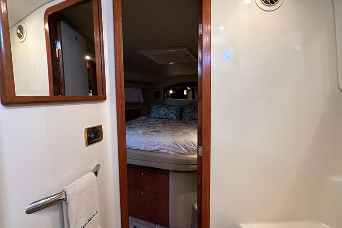 Her interior is spacious & has an upscale feel throughout. She has (two) staterooms with the master stateroom forward with private ensuite head and separate shower stall. The master stateroom also features a walk-around queen berth, flat screen TV, excellent drawer, cabinet and hanging locker storage.