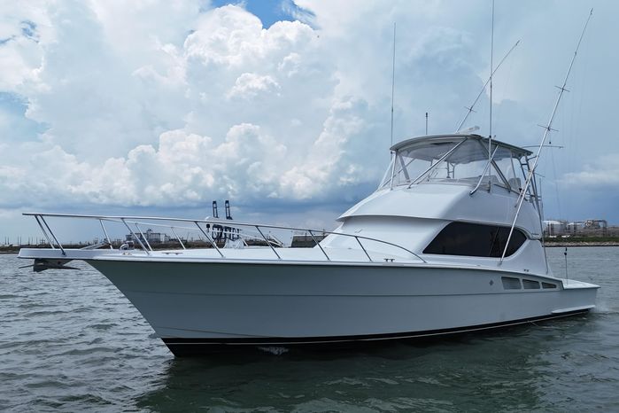 The Hatteras 50 Convertible, with her raked lines and curved edges, features a glass-smooth ride and offers power options able to attain speeds approaching 38 knots. Below-decks, the standard arrangement includes a spacious three-stateroom, and a two-head layout. Both master and bow staterooms boast queen walk-around berths with storage below. The full galley features a standard under-counter drawer-style refrigerator and freezer, a four-burner cooktop and microwave / convection oven. For a more expansive salon, the optional midlevel galley provides additional space for entertainment in the salon. In either arrangement, the salon show-cases standard fluted wood valances with blinds, L-shaped lounge seating with rod storage, a coffee table, and an ice maker. The flybridge features a pod-style tournament console with a recessed electronics box, a top-loading insulated drink box, and rod storage. The extended flybridge overhang delivers expanded walking room while also providing a haven from the sun for those in the cockpit. The 135-square-foot cockpit area includes both seawater and freshwater washdowns, a bait and tackle center, a drop-in bait freezer, rod holders, and a large fish box with macerator pump.