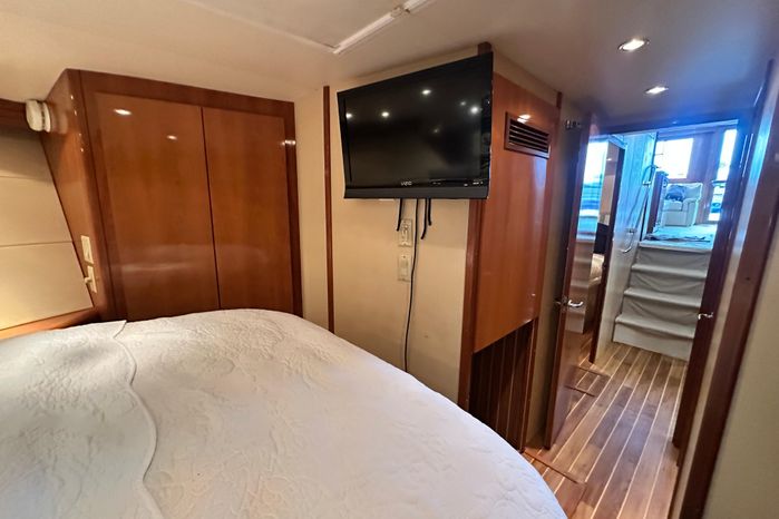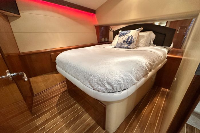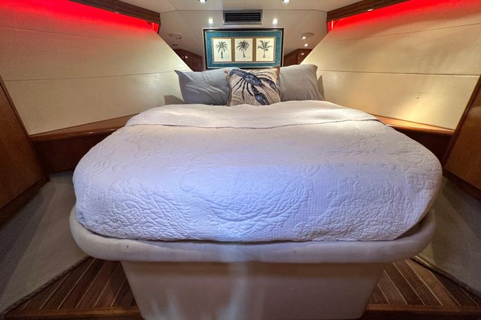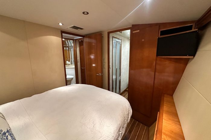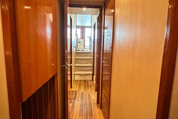 Moving forward of the galley area and down a few steps leads to the companionway. The master stateroom is amidships so starboard with walkaround queen bed, hanging locker, and en-suite head. The forward VIP stateroom has a centerline island berth and direct access to the second head, and the second guest stateroom to port features upper/lower berths, and private head access.