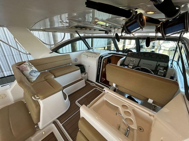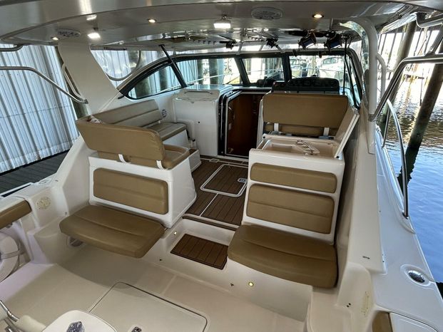 Tiara is one of the country’s premier builders of dual-purpose express boats with hard-core fishing capabilities and beautifully crafted interiors. Like all of Tiara’s Open models, the 3800 can be ordered as a tournament-ready fishing machine or equipped with the cruising amenities of a comfortable family express. Her elegant single-stateroom interior is dominated by a huge U-Shaped settee to starboard, opposite the galley. There’s a separate stall shower in the head, and the beautiful teak-and-holly cabin sole gives the interior of the 3800 a traditional feel found in few other boats. The cockpit, with about 70 sq. ft. of space, can be ordered with an aft-facing jump seat or a complete tackle center. The entire helm-deck lifts mechanically for easy access to the large engine room. She has a cockpit wet bar, a fold-down transom seat, transom door and shower, side exhausts and wide side decks.