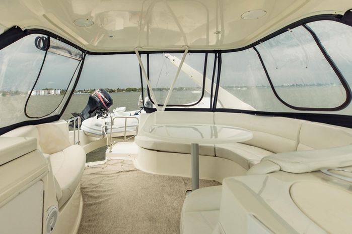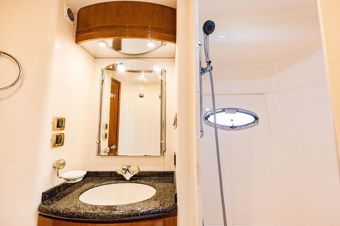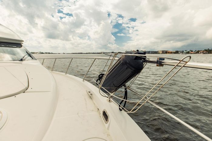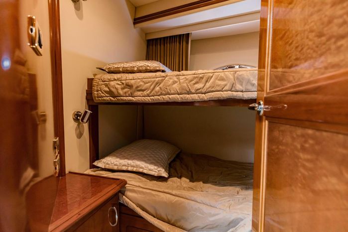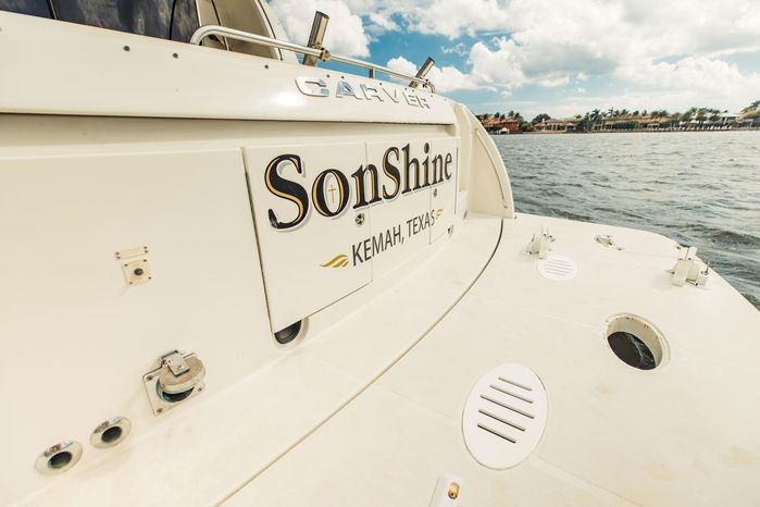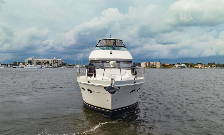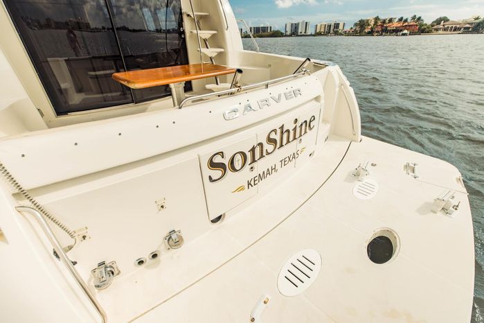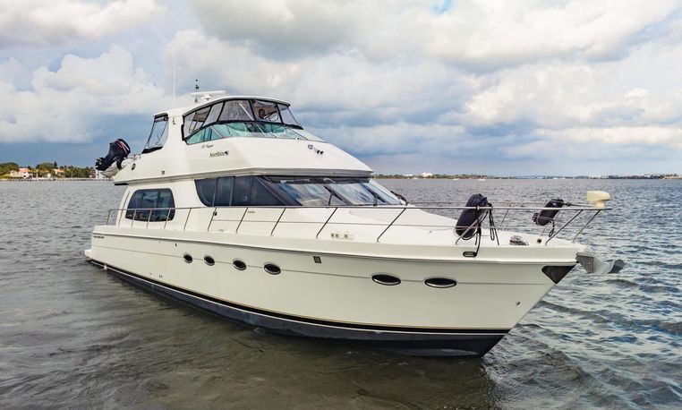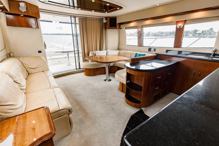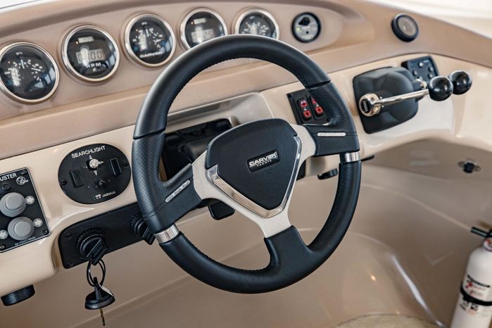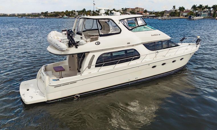 A top-selling boat, the Carver 560 Voyager is a stretched version of the Carver 530 Voyager, but with a revised main salon/galley and minor exterior styling updates including distinctive hull side windows. A heavily built yacht designed for extended cruising, the Voyager’s modest 15’4” beam results in somewhat smaller interior spaces than many motor yachts in this size range. That said, the salon’s social area includes twin wall hugging recliners, hi/lo cocktail table, and a comfortable L-shaped sofa to port. An entertainment system features a retractable 30” LCD TV that floats above the fully equipped galley when engaged. Big frameless windows and nearly seven feet of headroom make the Voyager’s salon seem especially open and airy. Below, the amidships master stateroom features a walkaround queen berth and ensuite head with tub/shower. The VIP guest stateroom forward includes a queen, and the second guest stateroom to port offers over/under bunks. The flybridge can be accessed from both the cockpit and the pilothouse. Volvo 675 diesels cruise at 22-24 knots (PowerBoatGuide.com)