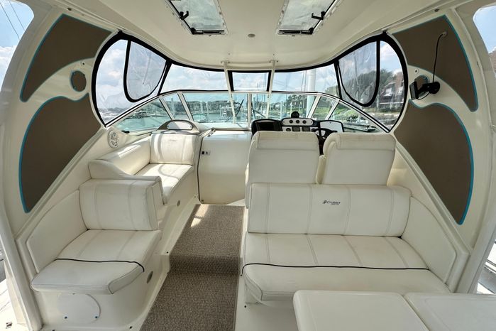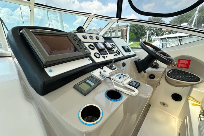 The 405’s express-style helm and cockpit are virtually on the same level, creating lots of opportunities for conversation between the Captain and his guests while underway. A sliding door next to the helm leads down to the salon. The helm is very ergonomic and features navigational electronics and amenities such as remote spotlight and bow thruster. The helm and cockpit are covered by a hardtop. A full express-style windshield provides exceptional weather and wind protection for the helm and the cockpit features comfortable seating and a full weather enclosure.