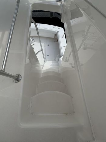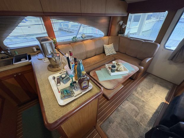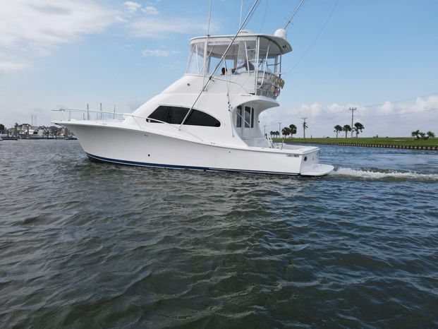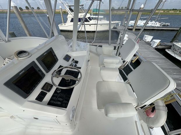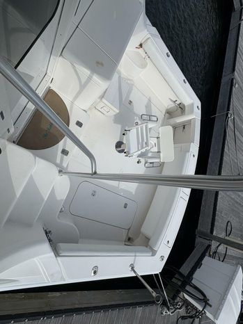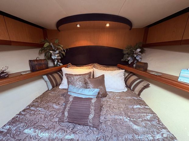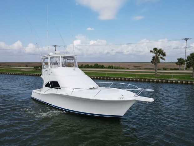 Offshore anglers will find a lot to like in the Luhrs 41 convertible, beginning with her rakish good looks and including a spacious interior and good open-water performance. Heavily built on a modified-V hull with prop pockets and a wide 15’, 9” beam, the two-stateroom interior of the Luhrs 41 includes a large master stateroom forward with an island berth and two big hanging lockers. The U-Shaped galley is forward in the salon which has an ultra leather sofa, twin barrel chairs, and a full entertainment center with a flat screen TV. Salon flooring is a rich teak and holly sole, washer/dryer unit. Topside, the 85 square foot cockpit has two large fish boxes in the sole and two smaller boxes in the transom. A tackle center is forward with LiveWell and sink, and a portside stairway leads up to the bridge with an L shaped bench seat forward of the helm console. A hardtop is standard. Note that the engine room of the Luhrs 41 is particularly well arranged. (Powerboat Guide)
