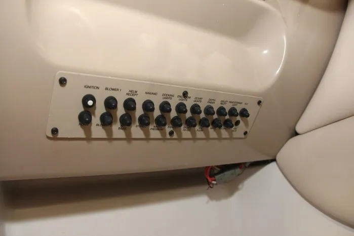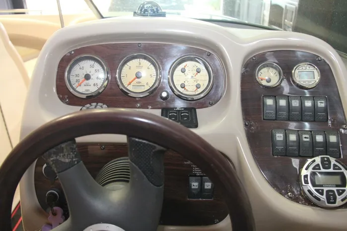 The helm station is a showcase of craftsmanship, featuring a real mahogany adjustable steering wheel and matching woodgrain instrument panels. Every control and accessory switch is intuitively placed, offering the captain both style and command at their fingertips.