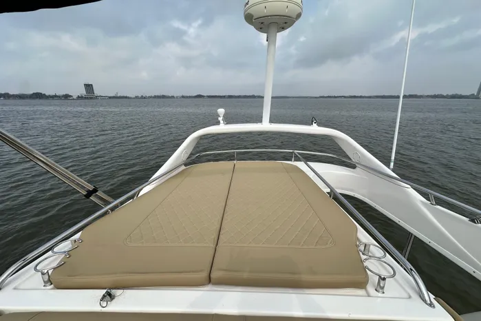 - Large Aft Flybridge Overhang with Large Sun-Pad and Stainless Steel Safety Rails/Drink Holders