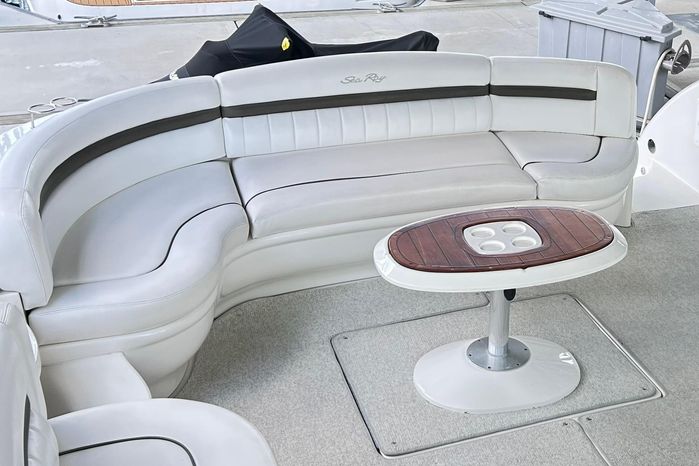 The 52 Sundancer takes a back seat to few when it comes to luxury and open-water performance. Built on a deep-V hull with prop pockets to reduce the shaft angle, the Sundancer's innovative cockpit layout is notable. Arranged with a unique rotating lounge, the cockpit forms a single entertaining area rather than the divided space found in other express yachts. Another major change is found below — instead of the ubiquitous mid-cabin floorplan found in most express cruisers this size, both of the Sundancer's staterooms are forward. While there is a foldout bed option aft, this area is now part of the main salon making it even more expansive than before with posh Ultraleather sofas, 6'8" headroom, and built-in flat-screen TV/DVD. There are two full heads in this layout, and the galley includes plenty of storage as well as a hardwood floor. An extended swim platform, cherry interior cabinets, and fiberglass hardtop were standard. A well-finished yacht, Cummins V-drive diesels cruise the Sundancer at 26–28 knots (30+ top).