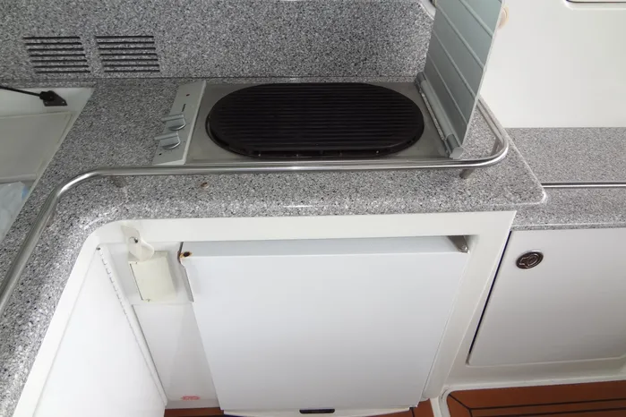 Below decks is entered via a large sliding centerline door. The Galley to port and Salon area to starboard.