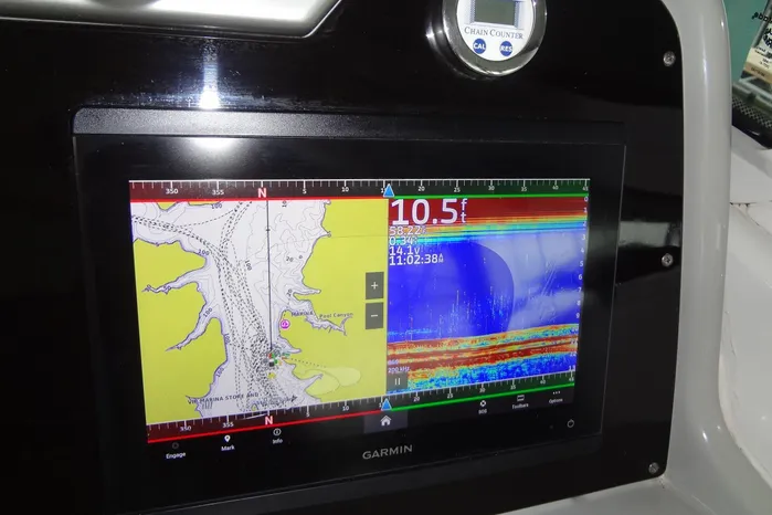 The Helm is to starboard with a great Garmin electronics package just forward of a double helm seat. Aft seating converts to day bed & sun bed.