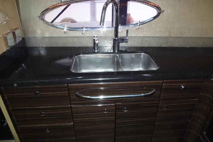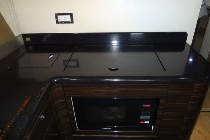 The Galley occupies the portside of the Salon area, is L shaped, and consists of the following equipment: