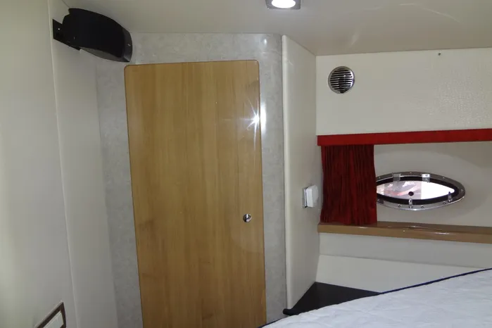 Next aft to starboard is the Zebrano wood door into the head and sink compartment. To port is the very large