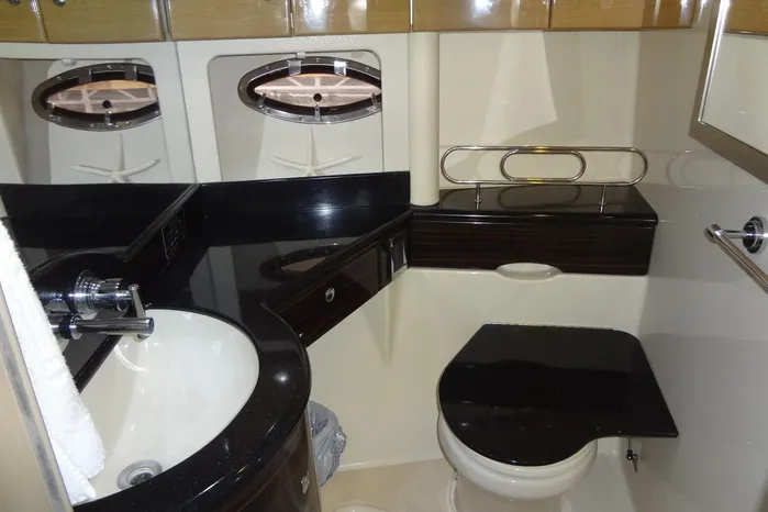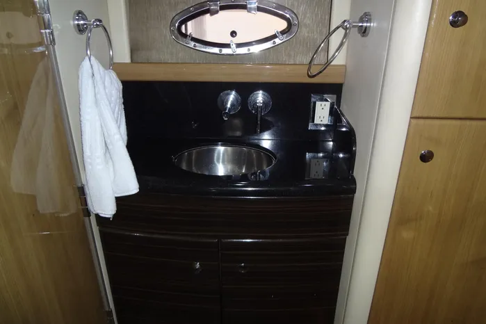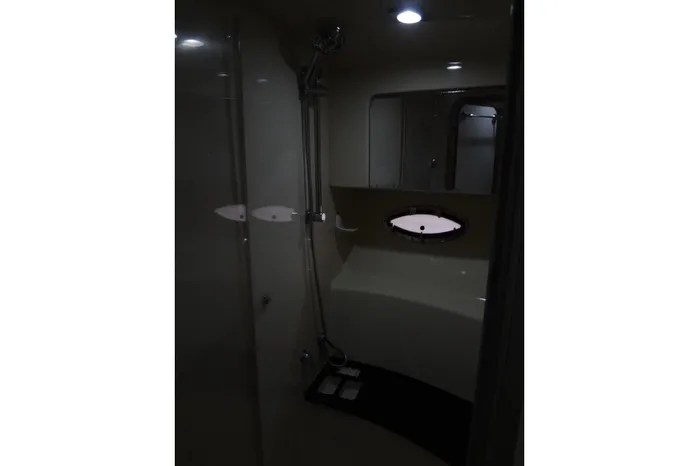 opening stainless steel porthole, a mirrored storage compartment and a light, an AC outlet and exhaust fan.