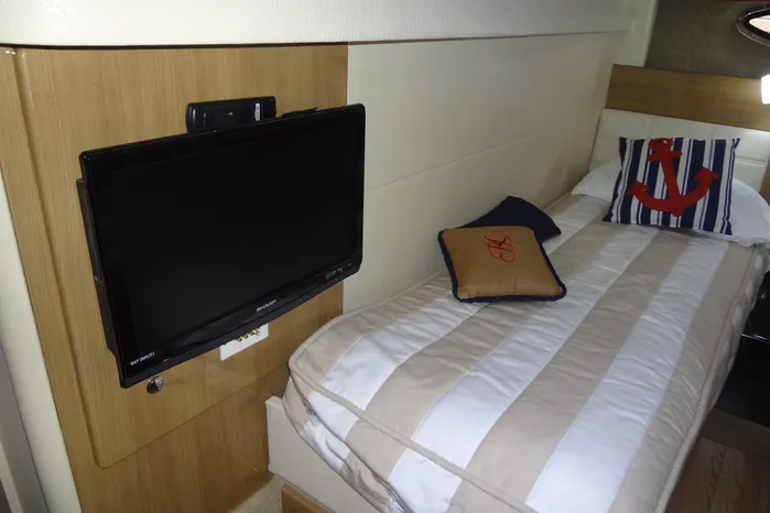 At the foot of the forward berth is a storage drawer below and a cabinet that opens to allow the 20" Sharp