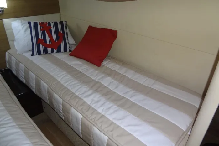 Aft to port of the Galley is the Guest Cabin with two athwartship single berths. Each berth has an upholstered