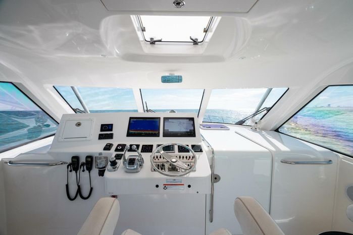- Molded fiberglass helm deck, hydraulically lifted with cockpit control unit