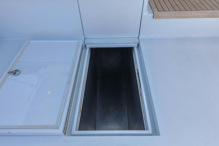- Starboard tackle storage cabinet with drawers and lid that raised electronically to show electronics screen.