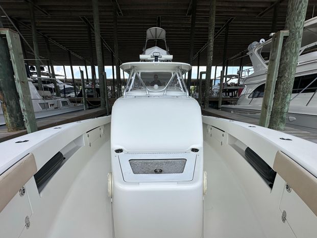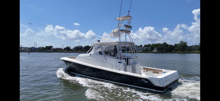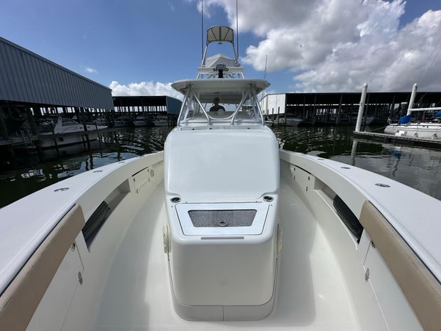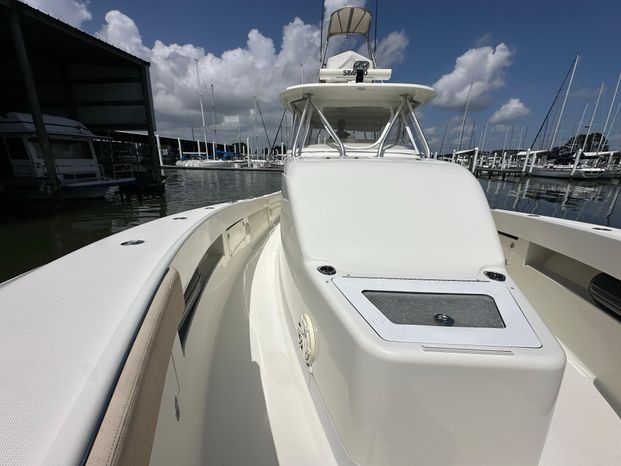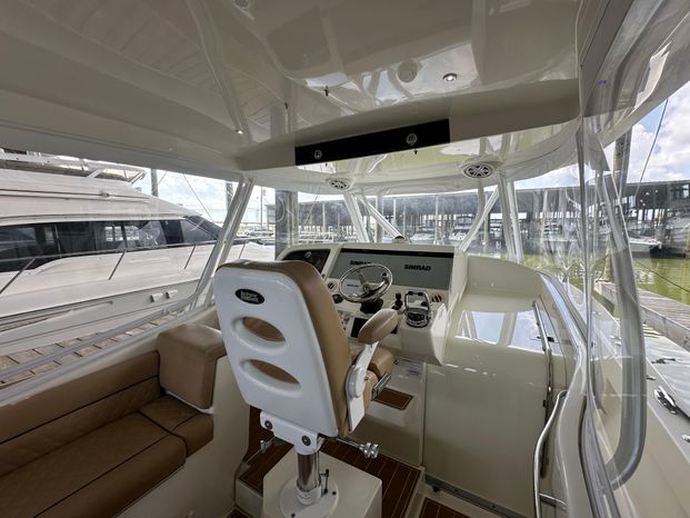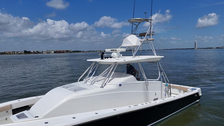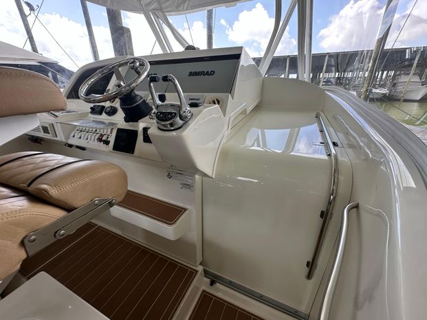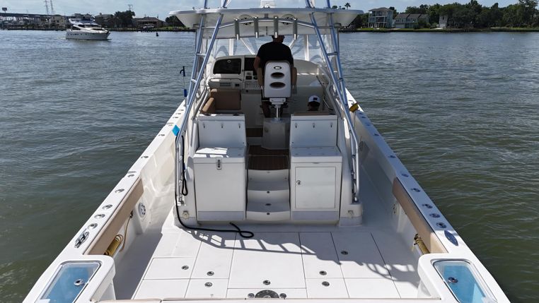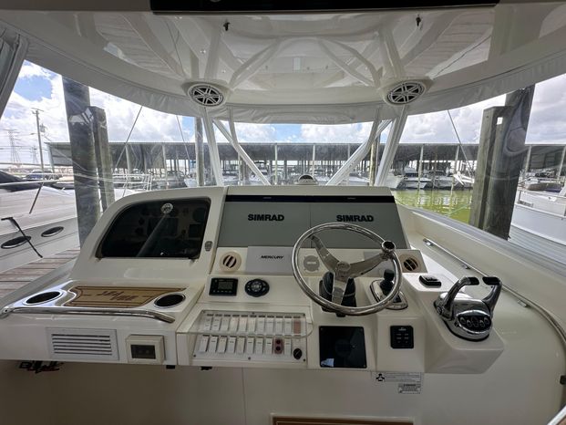 - Full Upper Molded Fiberglass Helm Station with Storage Cabinet, Stainless Steel Steering Wheel, Compass, Electronic Engine Controls, Joystick Controller, Trim Tab Controls, Stereo Remote Control, and Flush Mounted Electronics