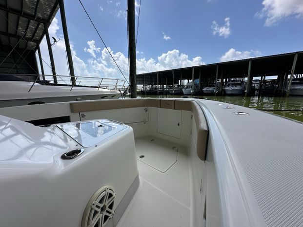 - Port Side Helm Deck Drop Down Seating with Pullup Adjustable Headrest