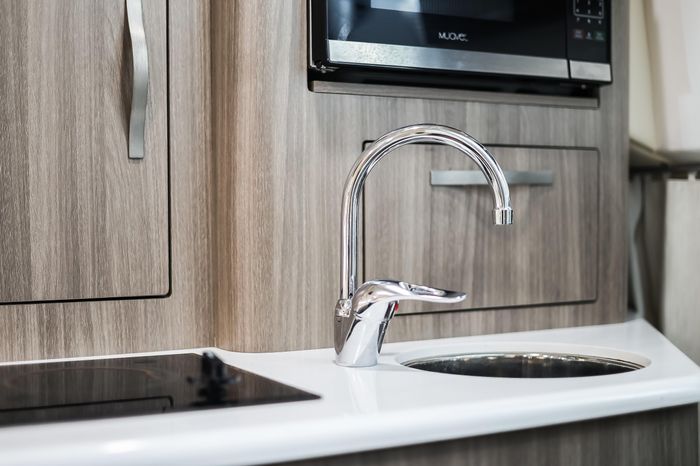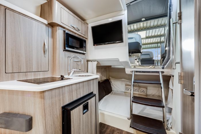Enjoy the convenience of air conditioning and instant hot water while spending the night aboard. The galley is fully equipped with a handcrafted Driftwood cabinetry, an electric burner cooktop, and a stainless-steel refrigerator—perfect for all your onboard meals.