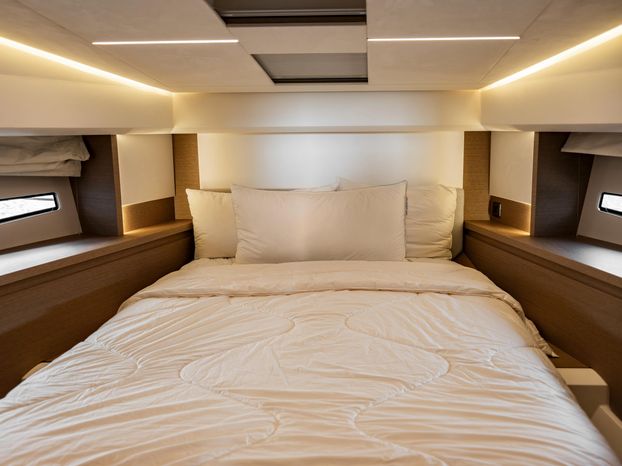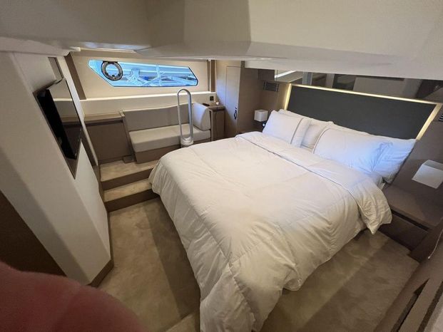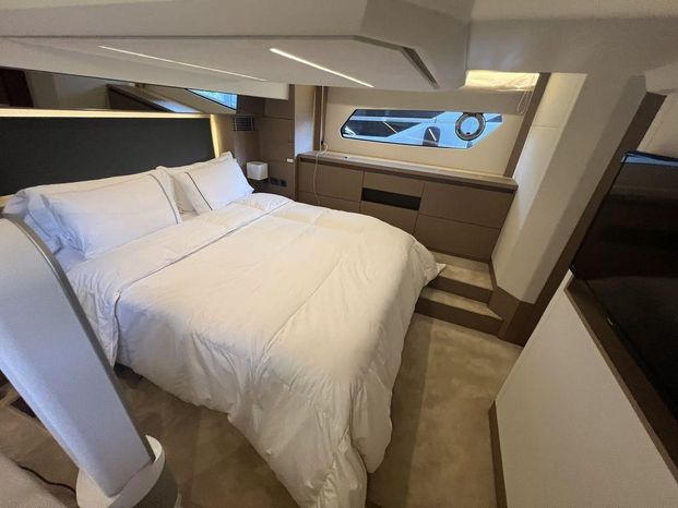 On the exterior, she features the signature style of the latest PRESTIGE Yachts, with an expanded, continuous line of windows in the hull. This Flybridge integrates the concept of the L-shaped cockpit, which allows for maximum use of space. Transformable into a very large aft sundeck, this cockpit can also house a fully equipped skipper cabin.