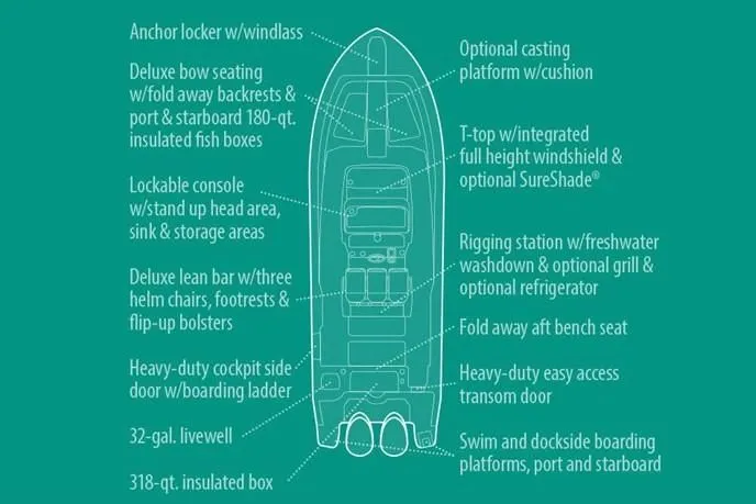 A modern center console with sleek style, Grady-White’s ALL NEW Canyon 326 delivers enhanced fishability with innovative design and ultimate comfort. From Grady’s exclusive SeaV²® hull to an expansive beam that sits the helm on center and features three deluxe contoured captain’s chairs, this 32-foot boat pairs high fishing functionality with luxurious comfort for family cruising. A phenomenal ride with smooth precision, the 326 has everything you’d expect in a Grady-White and more!