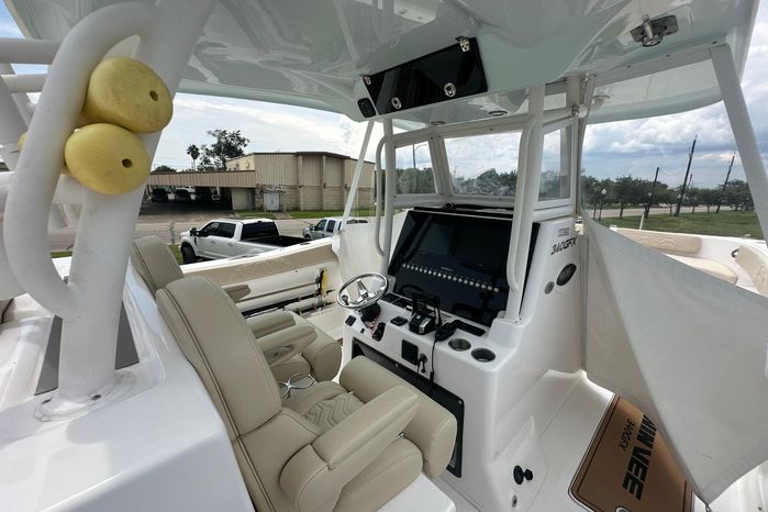 - Walk-in Center Console Offers a Large Storage Area for Bow Cushions and Marine Head, Access to Panels, Fuses and Switches, with a Roll Down Curtain to hide them. Battery switches