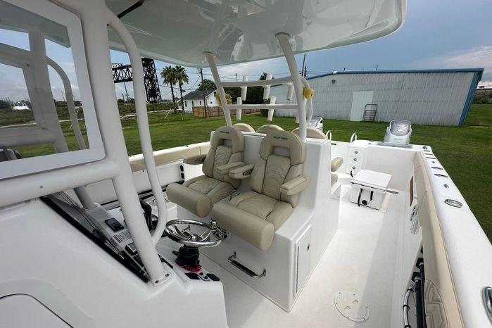 - Over-Sized T-Top with Molded Fiberglass Hardtop (Forward & Aft LED Spreader Lights, (6) Aft Support Rails Mounted Rocket Launchers, Aluminum is White Powder Coated, Overhead Electronics Box